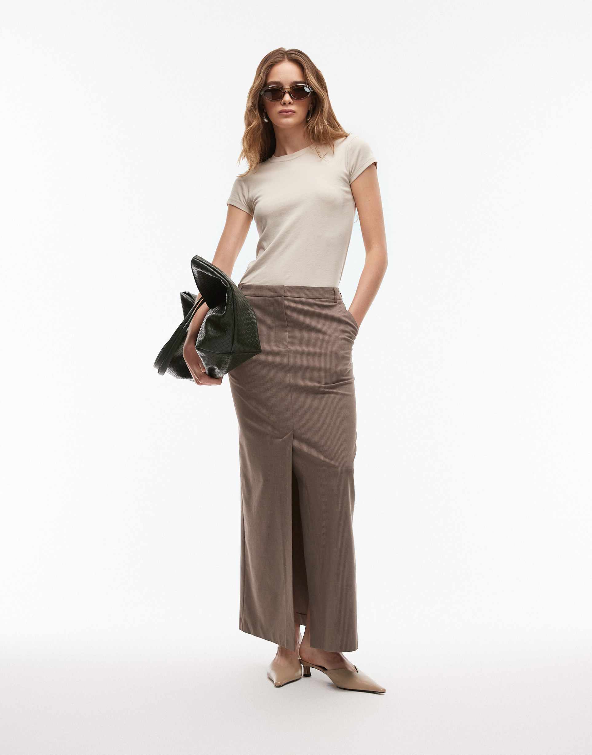 ASOS DESIGN TAILORED PENCIL MAXI SKIRT WITH HIGH SLIT IN BROWN PINSTRIPES