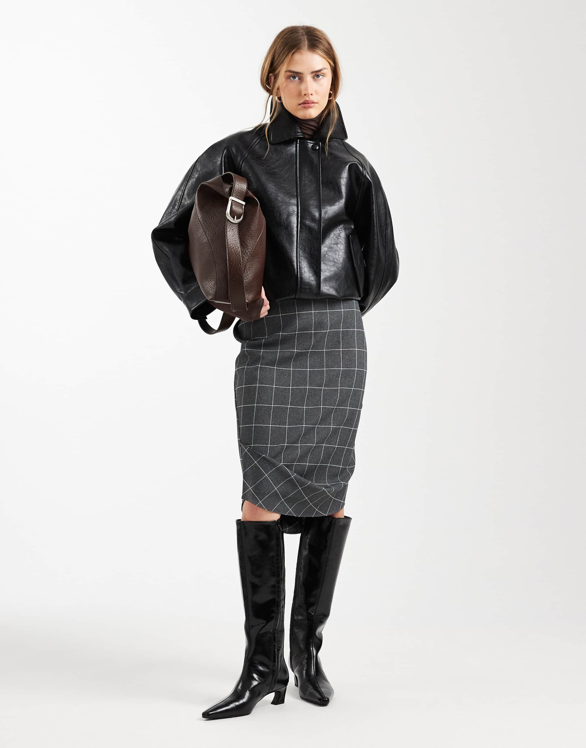 ASOS DESIGN TUCK DETAIL PENCIL SKIRT IN GRAY CHECK