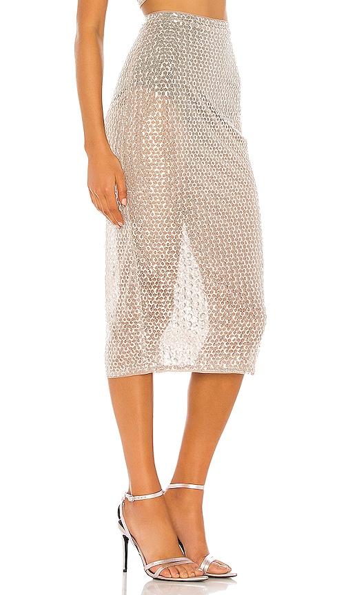 CAMILA COELHO BEATRIZ MIDI SKIRT IN METALLIC SILVER.