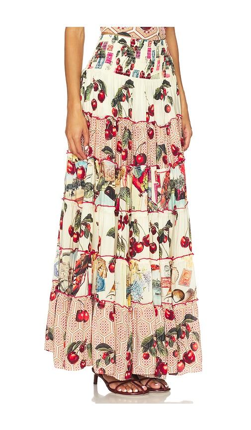 CAMILLA SHIRRED WAIST TIERED CIRCLE SKIRT IN CREAM.