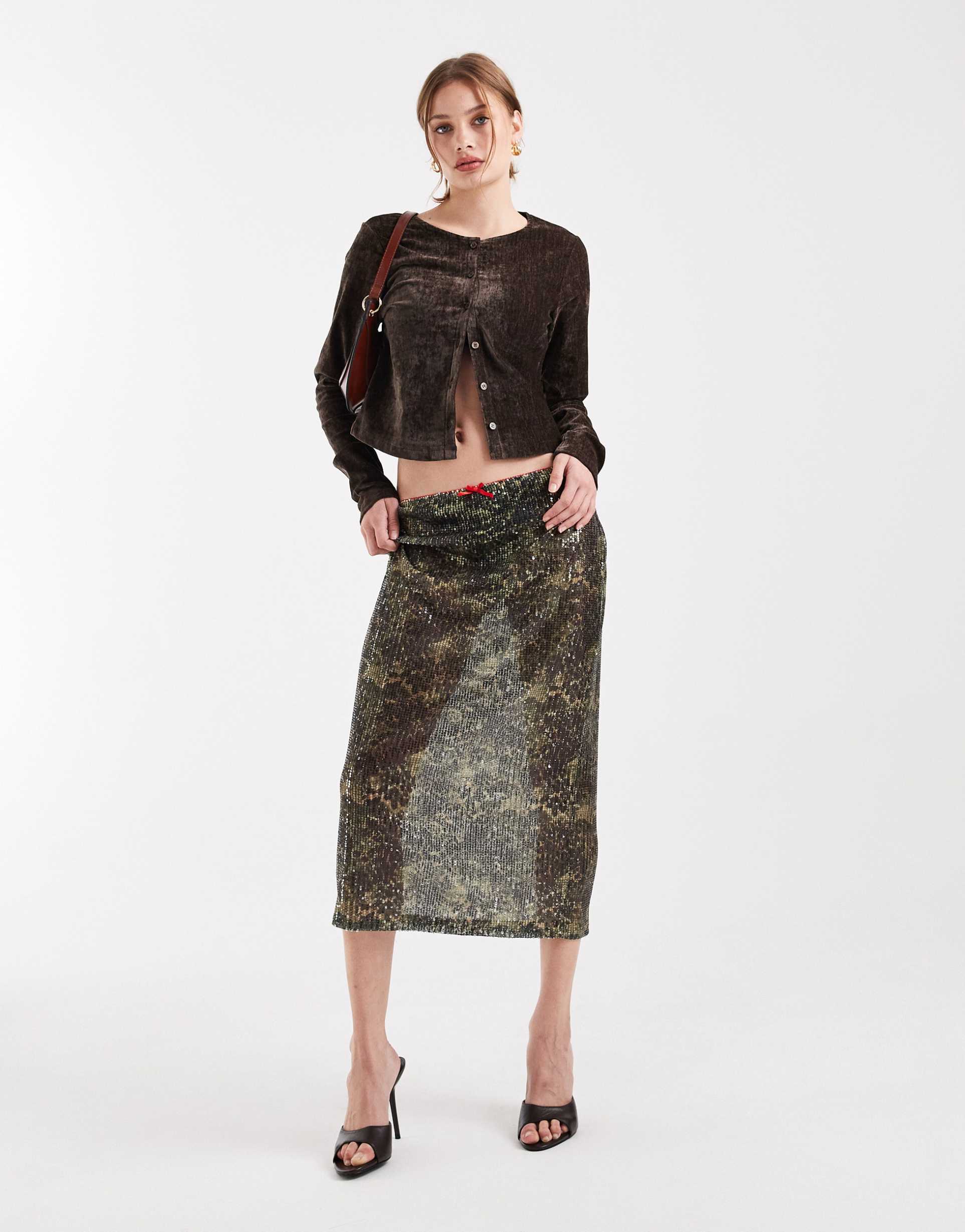 COLLUSION SHEER AWKWARD LENGTH SKIRT IN CAMO SEQUINS