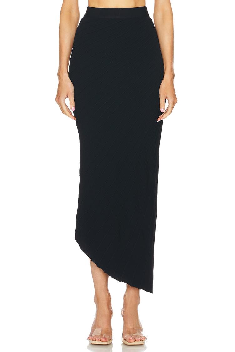 Effortlessly sleek and sculptural, the Ewen Knit Skirt from Cult Gaia brings refined texture to a black, body-skimming silhouette. Crafted in a soft rayon-polyester knit, it pulls on with a comfortable elastic waistband and an asymmetric hem that drapes gracefully from the waist to a longer, dramatic front. The textured knit adds depth to a minimal palette, making it easy to dress up with a satin blouse and heels or down with a tucked tee and sneakers. A versatile midi that transitions from day to night with modern polish and quiet confidence.
