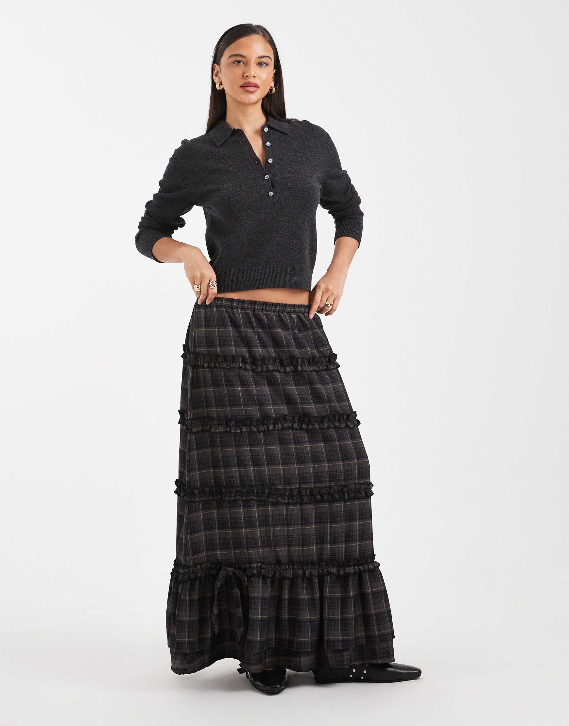 DAISY STREET TIERED RUFFLE BOHO SKIRT IN BROWN PLAID