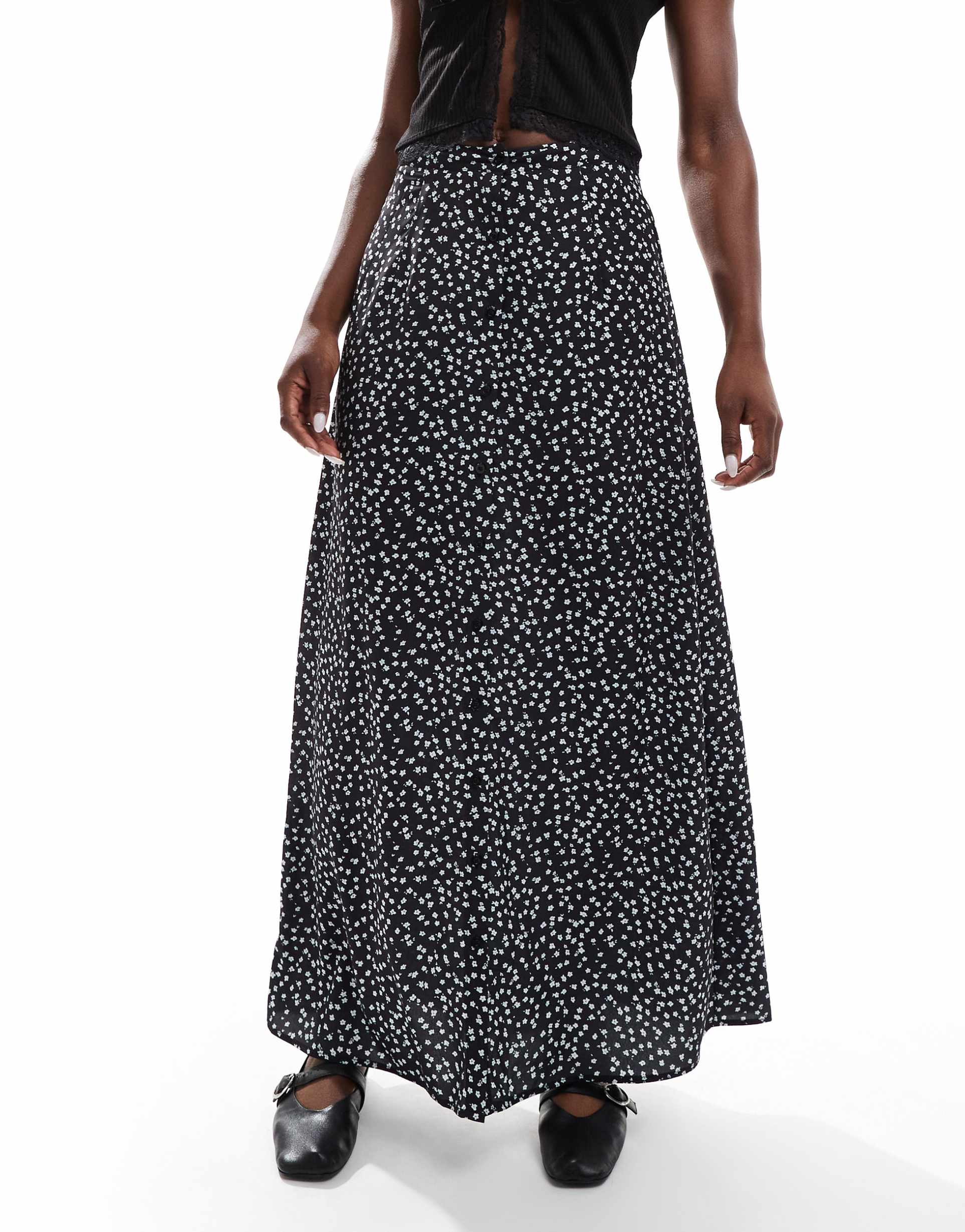 DAISY STREET BUTTON DOWN MAXI SKIRT IN BLACK DITSY FLORAL