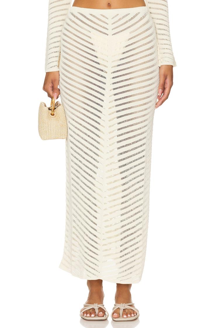 Redefine resort elegance with this Rafaella crochet maxi skirt from Devon Windsor. In an ivory cream tone, the open-knit stripes drape softly over the body, revealing a hint of skin through the sheer knit. The pull-on silhouette sits at the natural waist with an elasticated waistband for easy, comfortable wear. A subtle side slit adds movement and allure, while the all-over striped texture creates a sculpted, elongated line. Wear it over a bikini for beach days, or dress it up with a silky top and sandals for brunch or evenings out. Elevate warm-weather wardrobes with this versatile, statement staple.