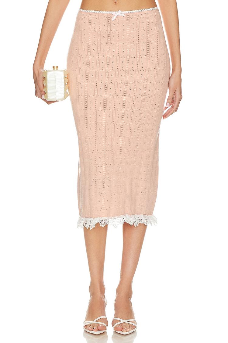 A soft, romantic silhouette for modern styling. This blush Andy Midi Skirt from For Love & Lemons is crafted in a cotton–poly blend knit with a delicate pointelle texture and lace-trimmed hem. The elasticated waistband ensures a comfortable, flattering fit while maintaining a sleek, fitted pencil shape through the midi length. A bow at the front adds playful charm, making it ideal for brunch with friends or a date night when paired with a silky top and heeled sandals. Elevate everyday elegance with this versatile, dressy-casual piece.
