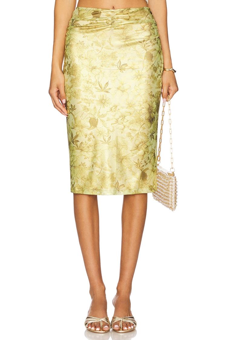 GCDS presents a Cocktail-ready Printed Lame Midi Skirt that radiates modern glam. The pencil silhouette flatters with a high-rise waist and a midi hem, while ruched panels add texture and movement. Self: 100% polyester with a fully lined interior, the midweight metallic mesh catches light as you walk. A hidden back zipper delivers a seamless line at the waist, and the flat-front waistband keeps the look pristine. Featuring an all‑over gold print with green botanical accents, it pairs beautifully with a satin blouse and heels for evenings that feel effortlessly sophisticated.