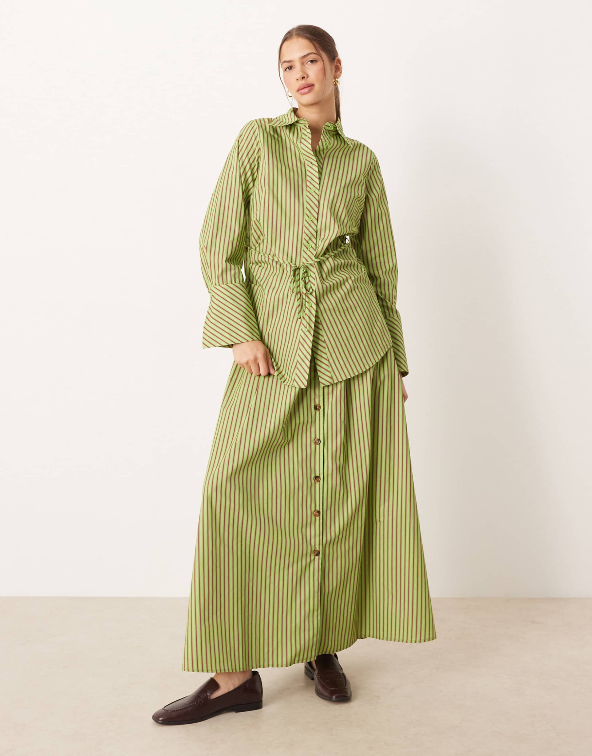 GLAMOROUS BUTTON DOWN MAXI POPLIN SKIRT IN GREEN RED STRIPES