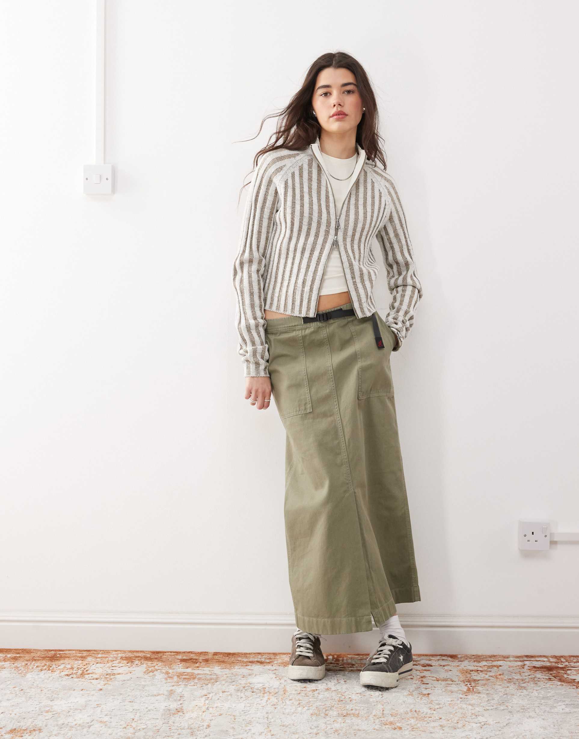 Bring effortless casual sophistication to your wardrobe with the Gramicci baker midi skirt in herb pigment. Crafted from breathable, lightweight 100% cotton plain-woven fabric, this skirt features a low-rise, elasticated waistband with an adjustable buckle for a customizable fit. The straight-leg silhouette falls gracefully to a midi length with a clean hemline, complemented by practical side pockets and a belted waist for added style and function. Perfect for everyday wear, travel, or laid-back outings in spring through autumn, this skirt combines modern comfort with casual chic appeal to elevate your relaxed looks.