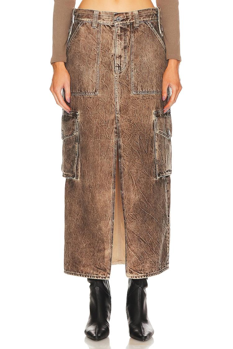 Coast into everyday moments with Grlfrnd’s Raquel Cargo Skirt in rich brown cotton denim. This high-rise midi fuses utilitarian flair with a sleek silhouette: a zip fly with button closure, classic 5-pocket design, and bold cargo pockets that add texture and function. A subtle front slit introduces modern edge to the long, straight cut, making it surprisingly versatile—from chunky knit and boots for casual chic to a cropped top with sleek boots for street-ready evenings. Durable yet drapey, this denim skirt elevates everyday outfits with fearless utility and effortless style.
