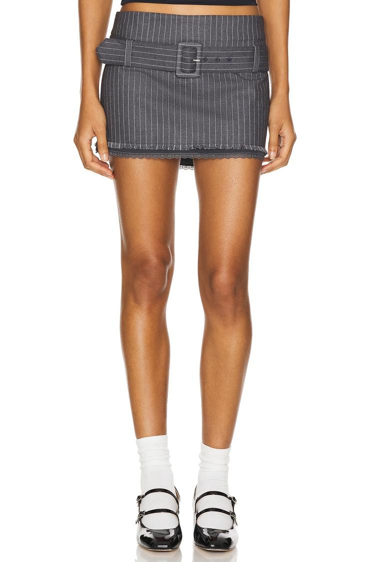 Guizio’s Andra Pinstripe Mini Skirt offers a poised blend of sharp tailoring and playful edge. This belted, high‑waist pencil silhouette sits neatly at the natural waist, ending in a delicate scalloped lace hem for a hint of romance. Crafted from a stretchable polyester– rayon–spandex blend (65% polyester, 30% rayon, 5% spandex; lining 95% polyester, 5% spandex), the fabric drapes smoothly with comfortable movement. The gray base with white pinstripes reads modern and versatile. Style it with a crop top and heels for a night out, or a blazer for smart‑casual daywear—polished, effortless, and endlessly wearable.