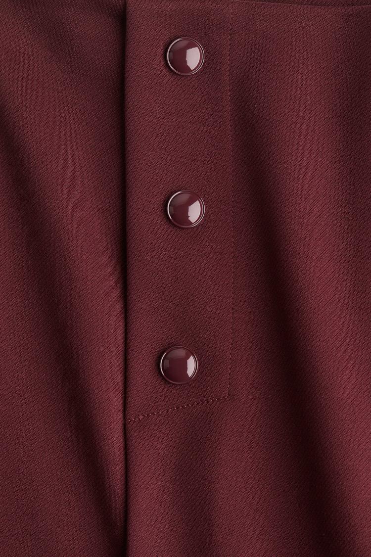 Bring effortless, timeless charm to your wardrobe with this button-front skort in a rich matte dark burgundy hue. Crafted from a structured woven fabric, it features a flattering mid-rise waist with a clean flat-front waistband and a classic A-line silhouette that gently flares out. The mini length and front button detailing add subtle sophistication, making it perfect for casual outings or everyday wear during cooler seasons like autumn and spring. Pair with cozy knits and ankle boots for a polished, minimalist look that balances comfort and style with ease.