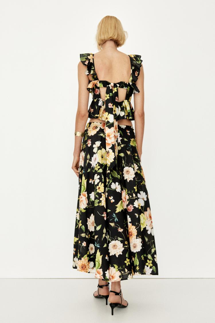 Elevate warm-weather silhouettes with this voluminous floral maxi skirt from H&M. Crafted in a breathable cotton-linen weave, it sits high on the waist with a concealed elastic waistband and a side zipper finished with a hook-and-eye for a clean, smooth line. The full, flowy A-line flare falls to a true maxi length, moving with every step. A lush floral print blooms across a black base—white, cream, pink, peach, lemon yellows with fresh greens—for a romance-ready vibe. Wear it with a simple top and sandals for brunch, beach walks, or vacation evenings. Effortless, versatile, and endlessly feminine.