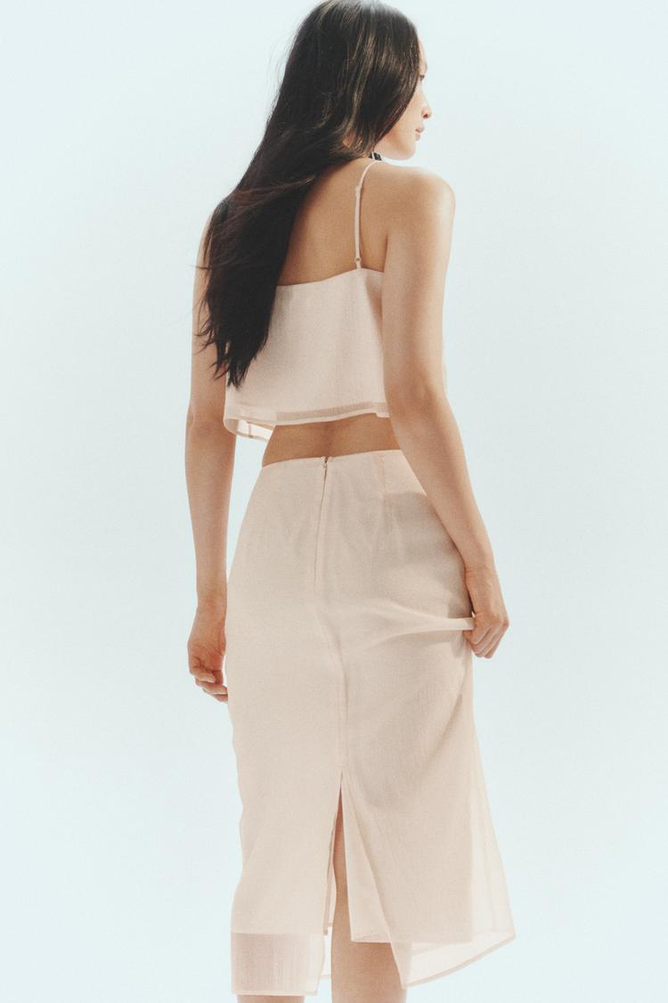 Embrace understated elegance with this light beige midi skirt adorned with delicate bead embroidery that adds a subtle shimmer to your look. Crafted from lightweight polyester, it features a high-rise flat-front waistband for a flattering fit and a clean hemline accented with a back slit for ease of movement. The sheer panels lend a breezy and sophisticated touch, perfect for spring and summer occasions. Whether styled for a casual brunch or everyday wear, this skirt pairs beautifully with minimalist tops and heels, offering a timeless, graceful silhouette that elevates your wardrobe effortlessly.