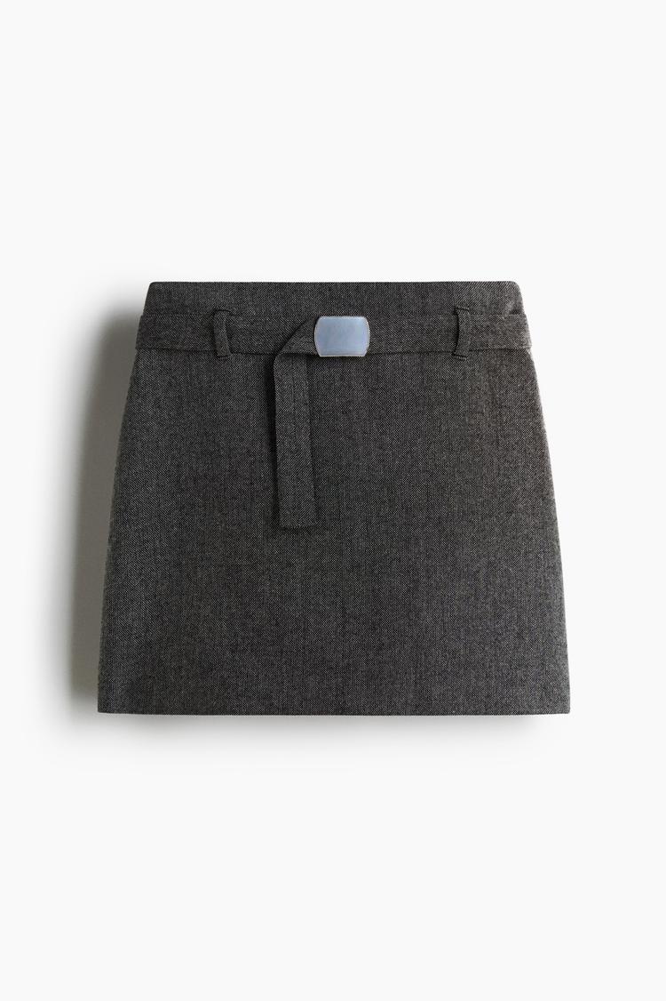 Bring a timeless edge to your wardrobe with this belted mini skirt crafted from cozy wool fabric in a sophisticated dark gray hue. The clean A-line silhouette offers a flattering, regular fit that sits at a regular waist rise, enhanced by a matching belt with a sleek buckle detail for a polished finish. Its minimalist design and crisp hemline make it an ideal piece for casual days or business casual settings during autumn and winter. Pair it with layered tops or a leather jacket for an effortlessly modern and classic look that transitions seamlessly from office to evening.