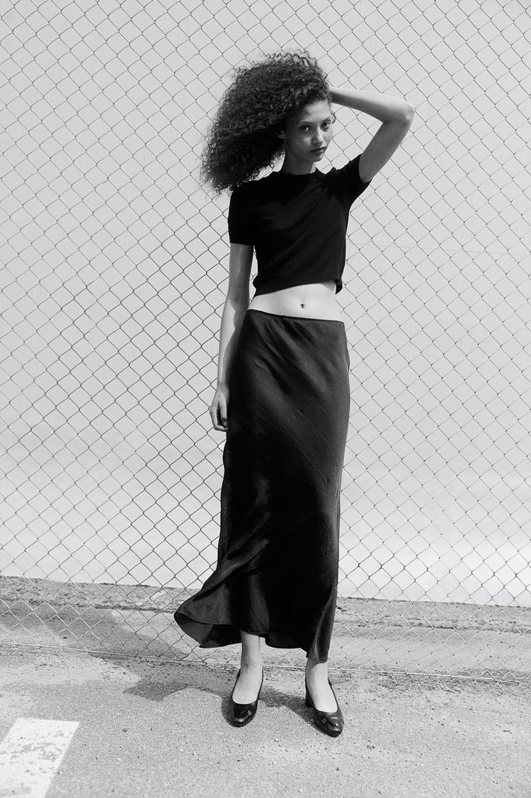 Long skirt in crinkled satin. Narrow, elasticized waistband and a straight-cut hem. Unlined.