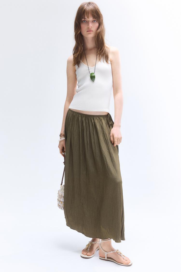 Grounded in easy, understated chic, this crinkled twill skirt brings laid‑back polish to everyday looks. The calf‑length silhouette sits at a flattering high waist with narrow drawstring ties and a concealed side zipper for a clean line. The cotton–linen blend creates a breathable, softly textured surface with natural crinkle that travels from day to night. In olive, it pairs effortlessly with a white tank and sandals for sunlit brunches, or dressed up with a silk blouse and flats for work‑from‑home meetings and casual commutes. Versatile, comfortable and effortlessly modern, this skirt is your go‑to for relaxed polish.