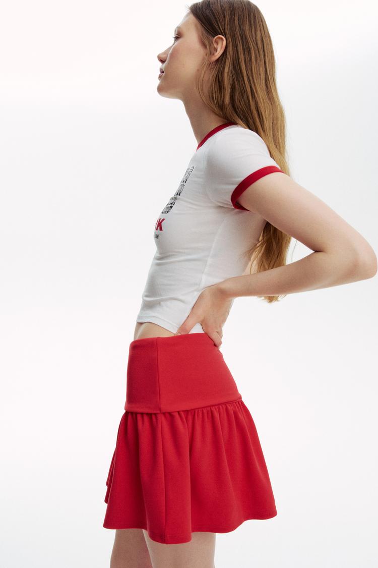 Red, relaxed, and ready for everyday wear. This Flared Jersey Skirt from H&M sits low on the hips with a wide fold-over waistband and a soft, stretchable jersey that moves with you. A gathered seam across the hips creates easy volume and a playful flare at the hem. Lightweight yet flattering, it pairs perfectly with tees, sneakers, or a cropped knit for a casual brunch, errands, or vacation strolls. Effortless to style and comfortable all day, it’s a versatile staple that adds color and ease to any look.