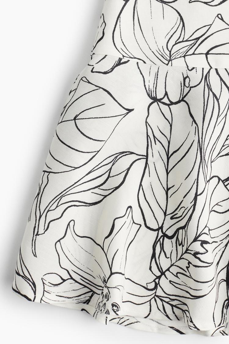 Step into a breezy, polished look with this Flared Mini Skirt in a cotton-linen weave. The ivory-toned base fabric is decorated with a refined black floral line print that travels all over, giving a contemporary botanical story. A wide waist creates a structured silhouette, with back shaping darts for a smooth fit, while a discreet side zipper lends a clean finish. Pair it with a crisp blouse and sandals for brunch, or a knit sweater and ankle boots for cooler days. Effortless, versatile and ready to elevate everyday outfits.