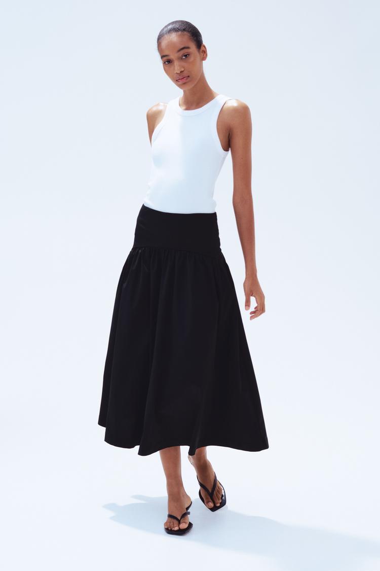 Move with effortless grace in this black flared midi skirt. Made from soft stretch jersey, the high‑rise waist pairs with a pull‑on, elasticated waistband for all‑day comfort. A curved, gathered seam at the hips creates a flattering contour and a fluid A‑line sweep to mid‑calf. The versatile silhouette transitions from desk to dinner with ease—tuck in a lightweight blouse for work, or team with a relaxed tee and sandals for weekend errands. Minimal yet chic, this skirt keeps your looks polished, comfortable, and endlessly wearable.