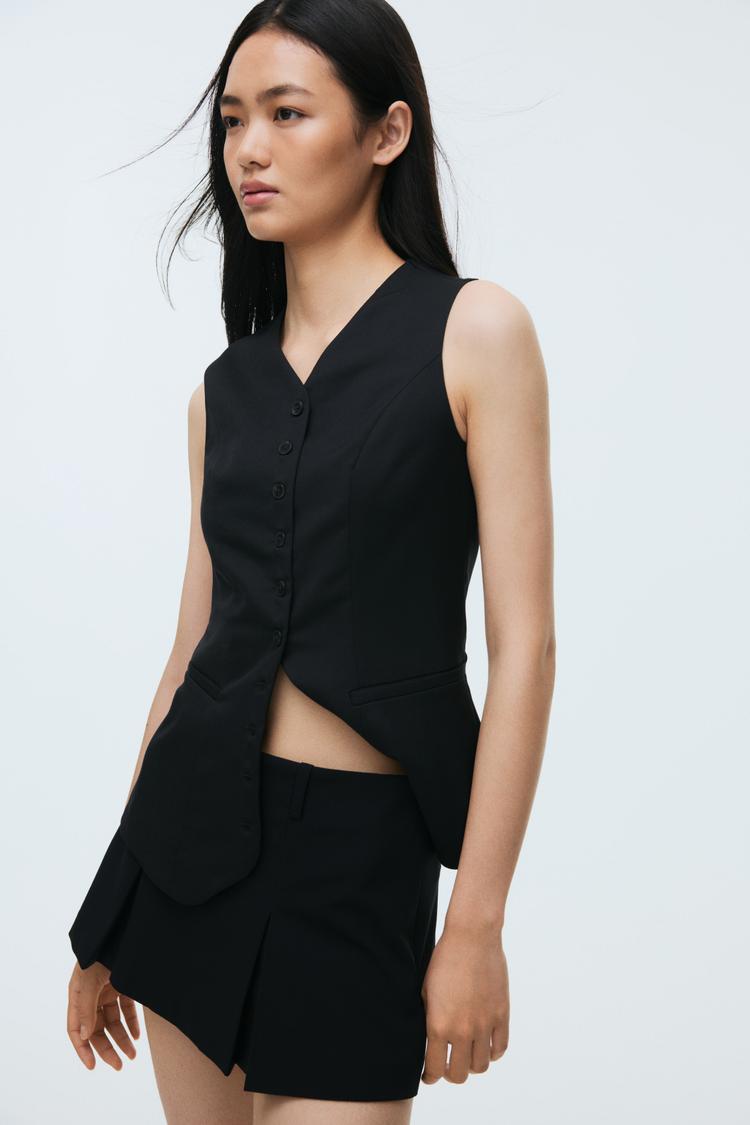 Bring a touch of sleek sophistication to your casual wardrobe with this black pleated mini skort from H&M. Crafted in a smooth, matte black fabric, it features a flattering mid-rise waist and a clean, flat-front waistband for a streamlined silhouette. The crisp pleats at the front add subtle movement and an elegant design detail, while the mini length keeps it youthful and versatile. Perfect for casual outings, brunch dates, or streetwear-inspired looks, this skort combines the ease of shorts with the chic appeal of a skirt. An essential piece for minimalist and modern styling, it pairs effortlessly with a variety of tops for a polished yet relaxed vibe.