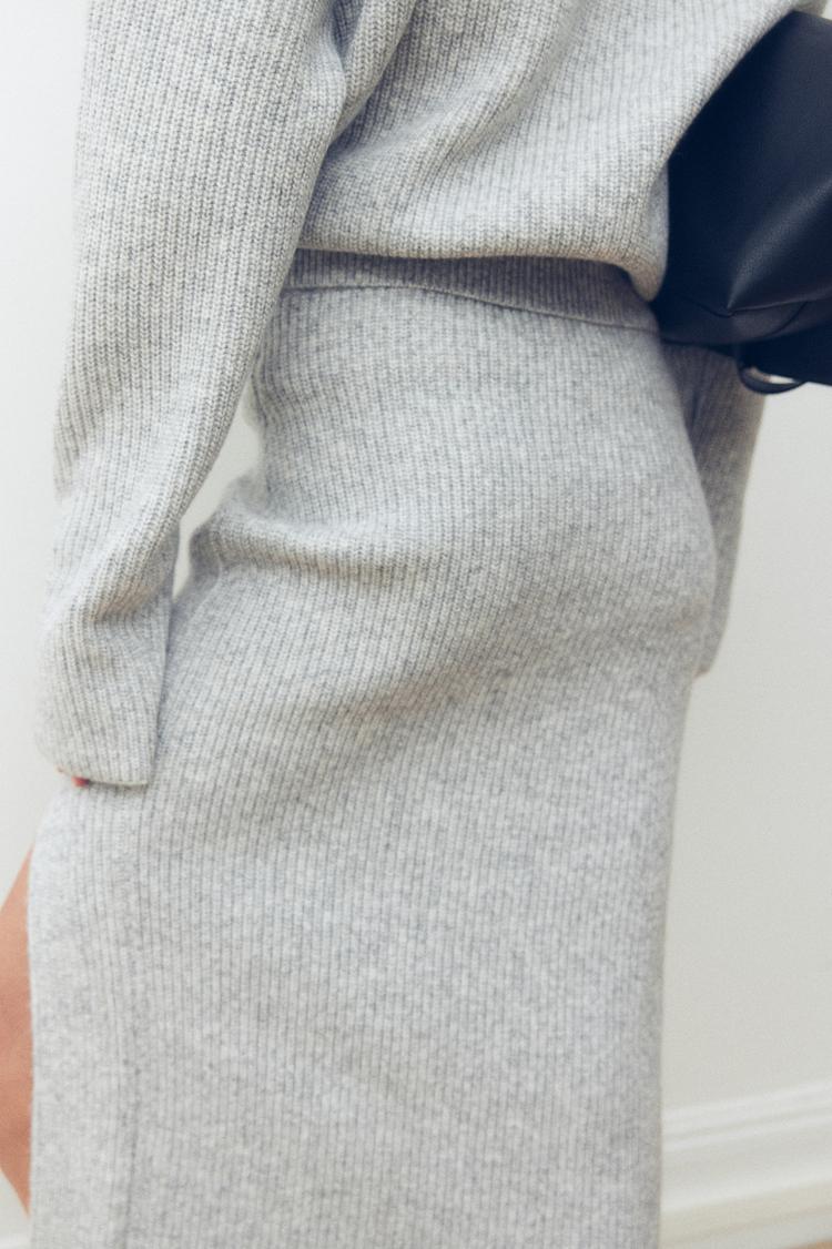 Fitted, ankle-length skirt in a soft rib knit. High waist, elasticized ribbing at waistband, and a straight hem with a high slit at one side of front.