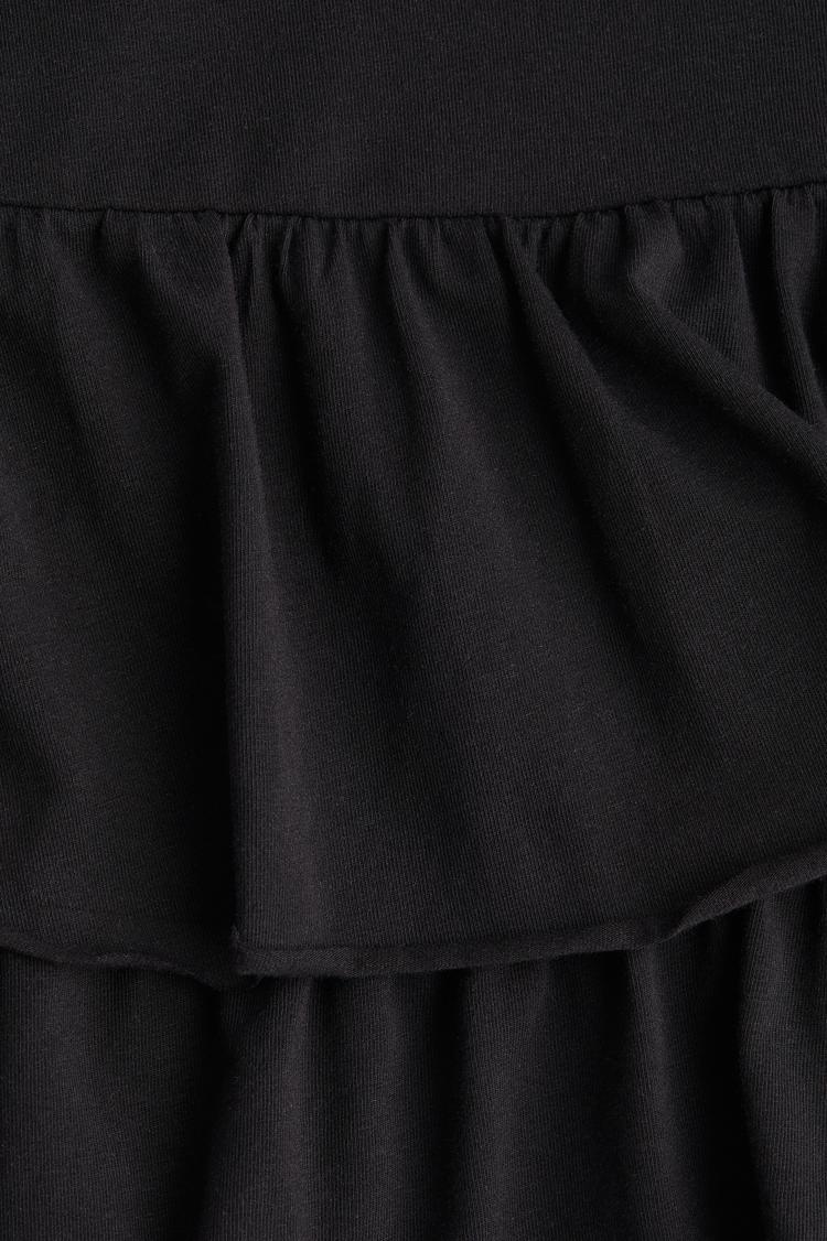 Bring playful charm to your casual wardrobe with this black tiered jersey mini skirt from H&M. Crafted from soft, lightweight, and stretchable jersey fabric, it offers comfortable wear with a flattering mid-rise and an elasticated waistband for easy pull-on styling. The skirt features layered ruffles that add feminine movement and a flirty silhouette, perfect for everyday outings or brunch dates. Its regular fit and mini length make it easy to pair with a variety of tops and shoes, creating effortless chic looks for spring through autumn. A versatile staple that combines comfort with flirty flair.