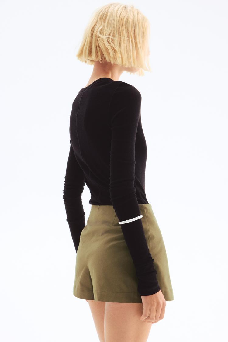 Bring a fresh and streamlined vibe to your casual wardrobe with this olive green wrap skort from H&M. Crafted from soft matte cotton, it features a flattering mid-rise waist with a clean flat-front waistband for a sleek silhouette. The mini length and front slit add a subtle hint of allure while ensuring ease of movement. Perfect for spring through autumn days, this versatile piece pairs effortlessly with fitted tops or layered knits for brunch dates, casual outings, or everyday wear. Embrace minimalist style with a modern twist in this effortlessly chic and comfortable skort.