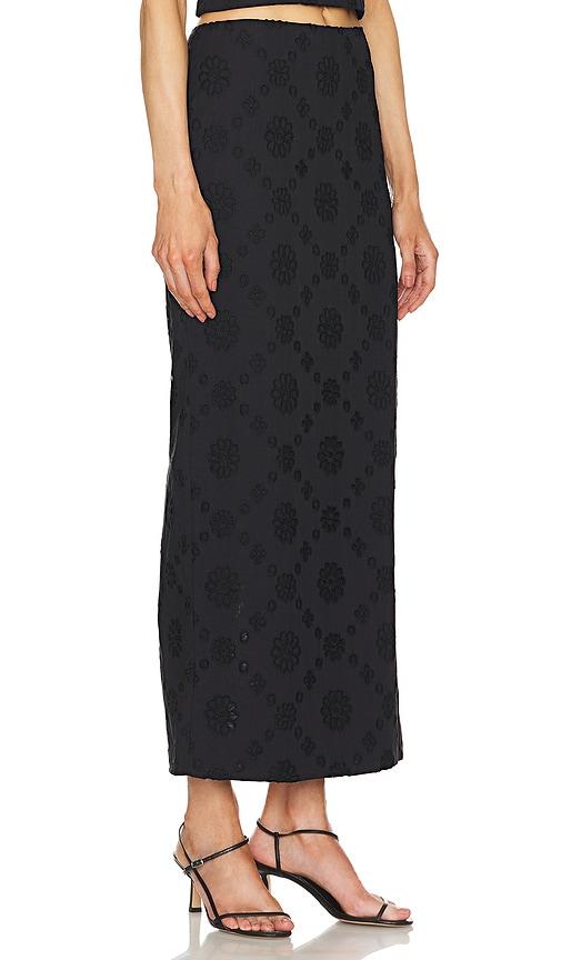 HELSA EYELET COLUMN MIDI SKIRT IN BLACK.