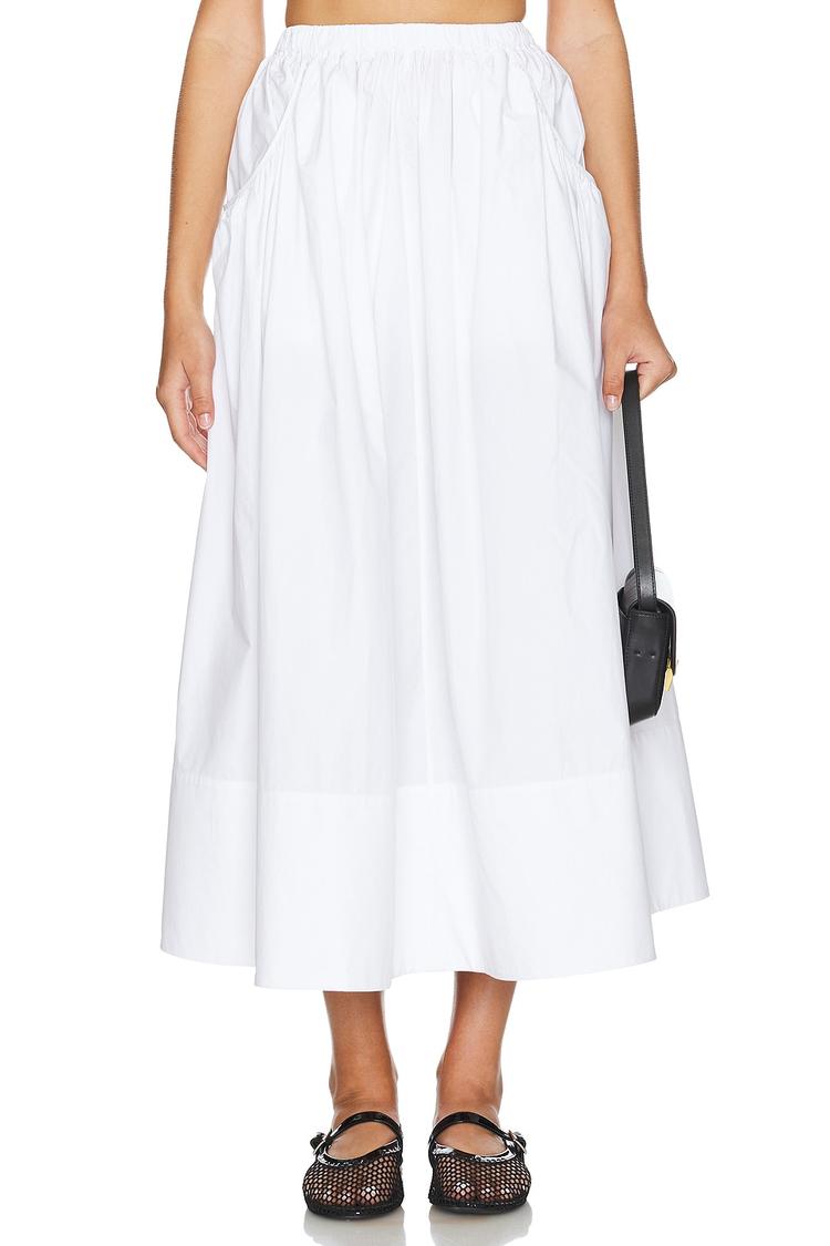 Effortless elegance meets everyday ease with this L'Academie midi skirt. Crafted in soft, breathable cotton poplin, the A-line silhouette flares gently from a comfortable elastic pull-on waist, delivering a flattering moveable drape. The crisp white fabric is unlined and muted, with practical side pockets that keep essentials within reach. A layered hem adds subtle texture to a clean, minimalist look that's equally at home with a chambray blouse for work days or a breezy knit for weekend errands. Pair with sandals, loafers, or sneakers to tailor the mood from casual to refined in moments.