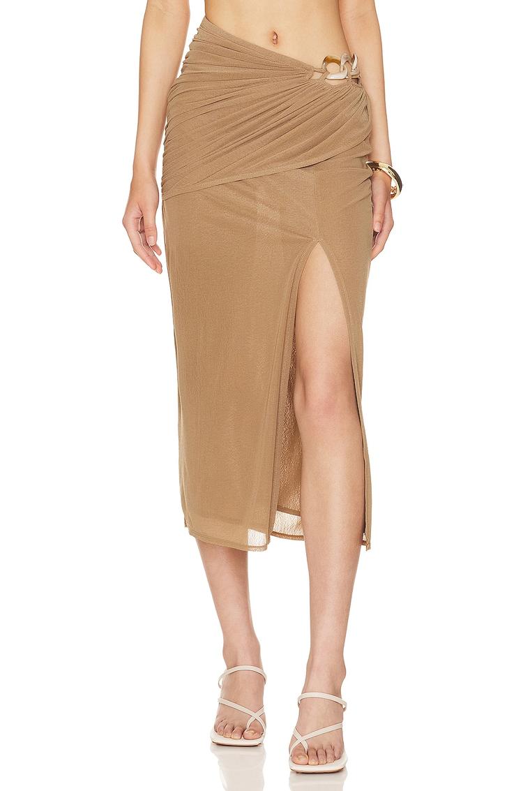 Effortlessly chic and endlessly versatile, the Florra Midi Skirt from L'Academie drapes in a warm beige tone with a wrapped silhouette that falls to a mid-calf length. A front leg slit adds a flirty hint of movement, while the draped mesh overlay sits over a double-lined base for smooth coverage. The hidden side zipper ensures a clean, streamlined silhouette and an acrylic chain detail at the hip gives a subtle fashion-forward edge. Style with a silk blouse and strappy heels for evening allure or a lightweight tee for daytime brunch-worthy ease.