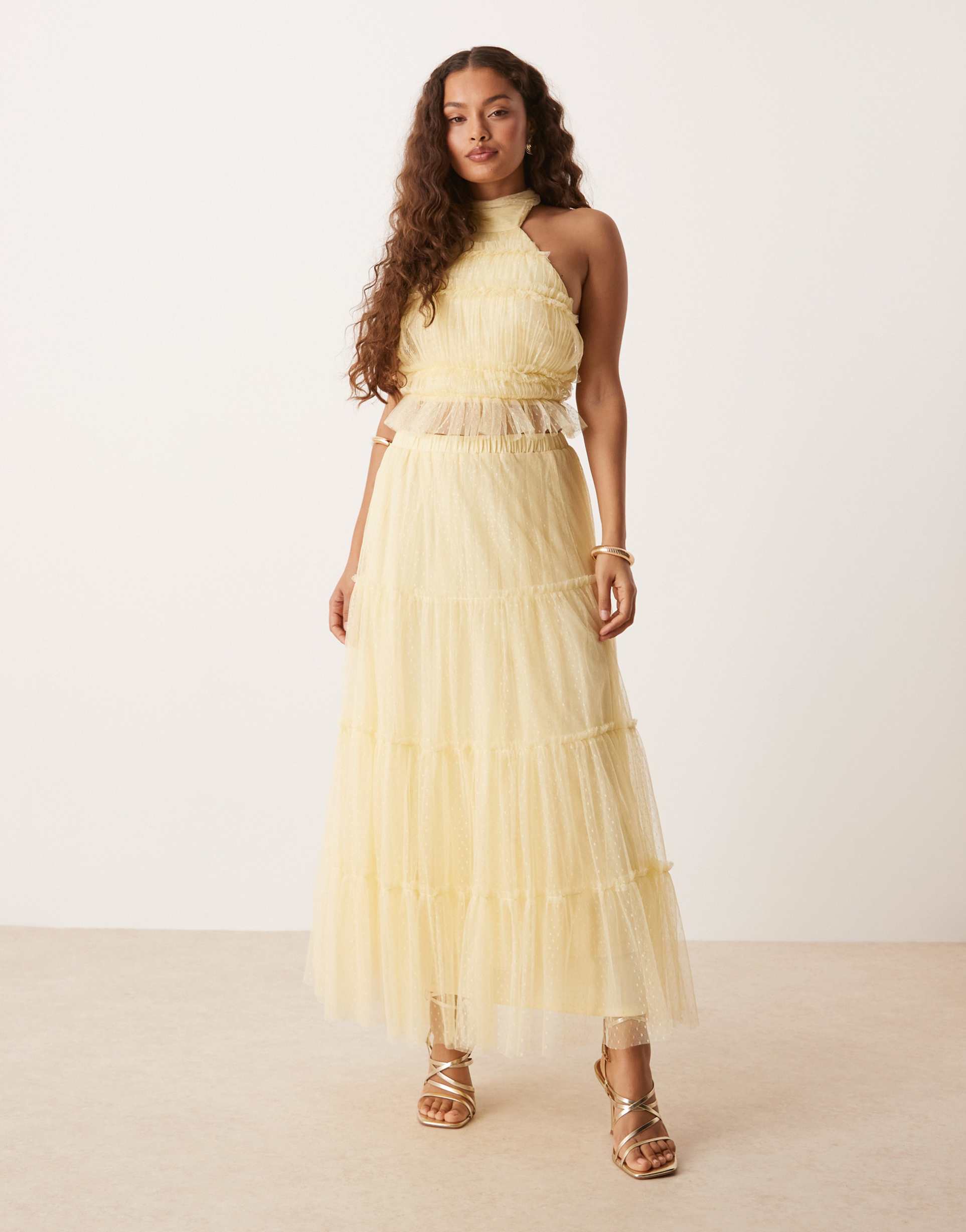 LACE & BEADS PETITE TIERED RUFFLE MAXI SKIRT IN LEMON - PART OF A SET