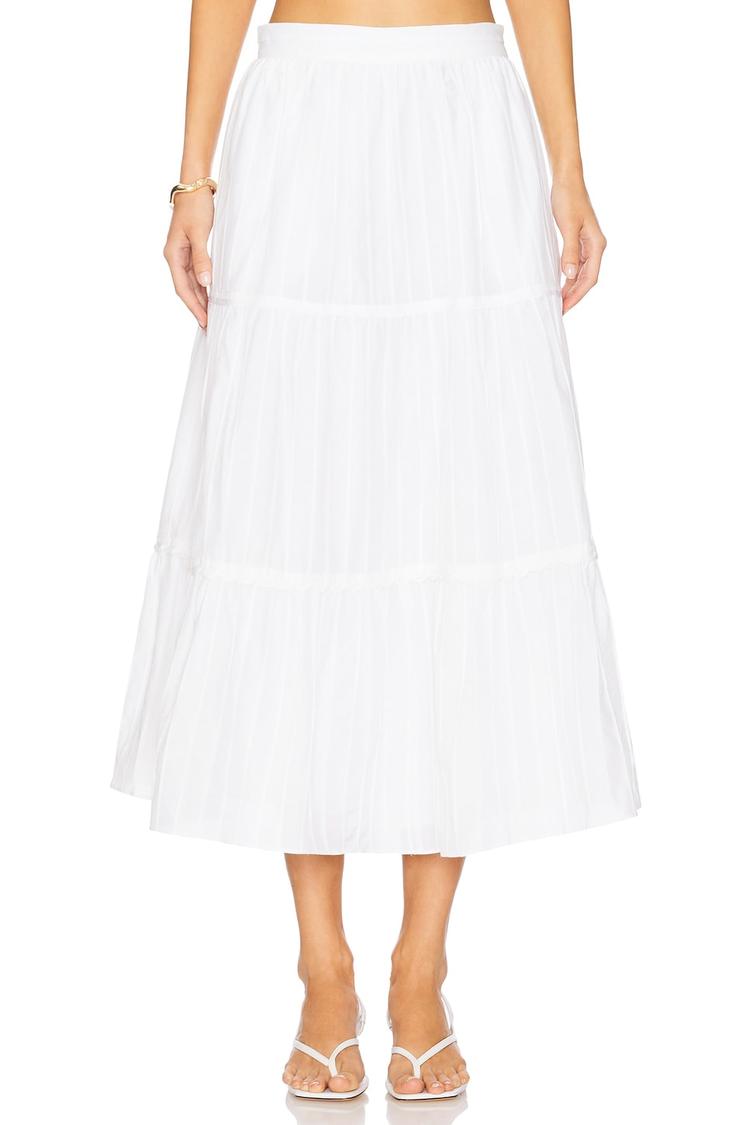 Effortless elegance meets everyday ease in this white tiered midi skirt. Crafted from a refined cotton-silk blend, the midweight poplin drapes in soft, airy tiers that move with you for a feminine, buoyant silhouette. Fully lined for polished coverage, it features a hidden back zipper for a clean waist and a flat-front waistband for a smooth, seamless fit. Side mesh panels add a contemporary texture to the timeless design. Pair with a crisp blouse for brunch, or a silky cami for evening outings—this versatile piece elevates any warm-season look.
