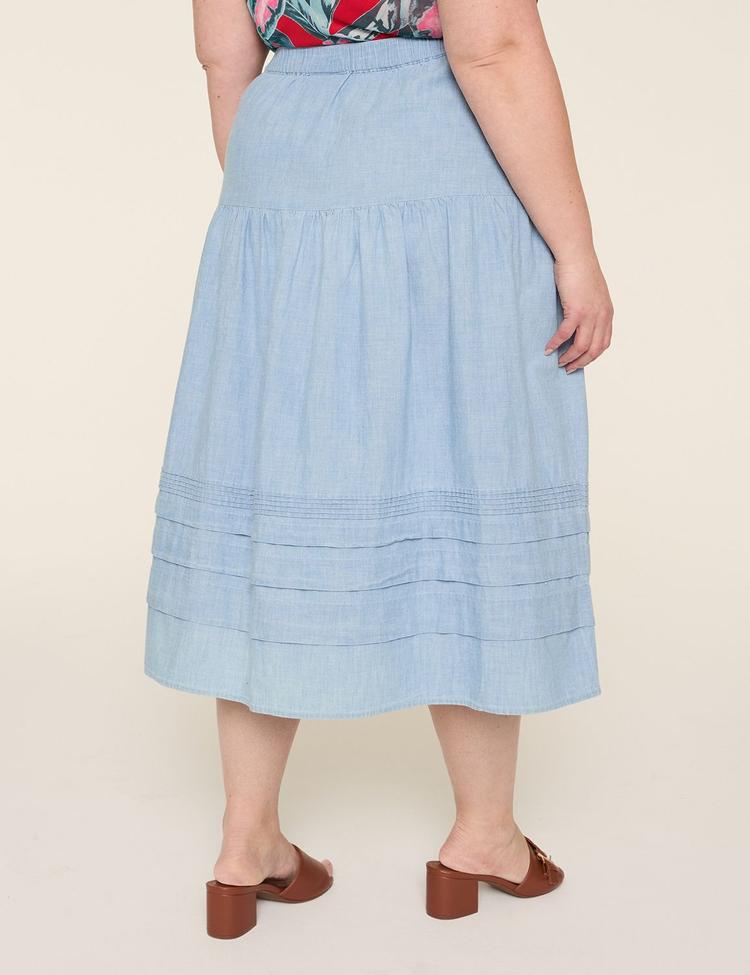 Embrace effortless elegance with our Plus Size Chambray Pintuck Skirt, designed for those sunny days ahead. This midi-length skirt features soft, breathable chambray fabric that moves with you, making it perfect for everything from brunch dates to relaxed weekend outings. The covered elastic waistband ensures comfort, while pintuck detailing adds a touch of sophistication. Pair it with your favorite top for a timeless look that transitions easily from day to evening. Experience the versatility of this essential piece for your warm-weather wardrobe.