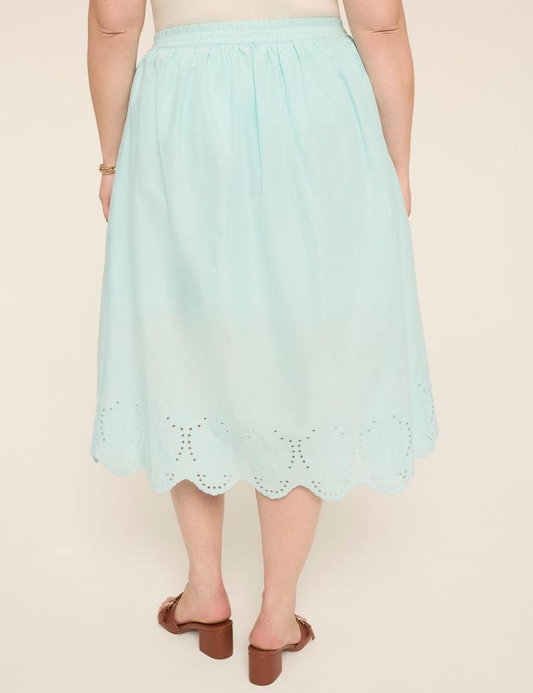 Embrace effortless springtime elegance with this plus-size eyelet maxi skirt in a soothing light blue hue. Crafted from breathable cotton with a soft polyester embroidery lining, it offers a relaxed fit and comfortable elasticated waistband for all-day wear. The midi length falls gracefully with a scalloped hemline adorned with delicate embroidery, adding a romantic and classic touch to your look. Perfect for casual outings, brunches, or everyday wear, this skirt blends comfort and style seamlessly, making it an essential piece for your warm-weather wardrobe.