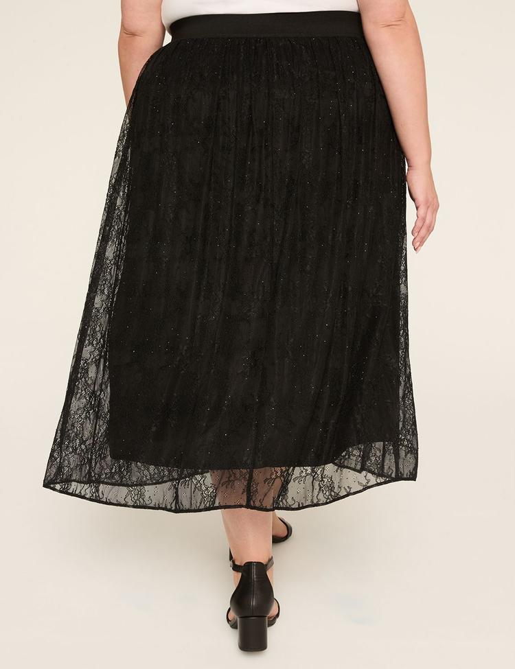 A romance of motion and texture, this black lace maxi skirt promises a refined yet playful evening moment. The full, flowy silhouette drapes elegantly, while an elasticated covered waist adapts to you with effortless comfort. Allover lace with a soft lining creates a sophisticated contrast that’s both breathable and flattering, and rhinestone embellishments catch the light with every step. The scalloped hem adds delicate finish to a piece that’s instantly dressy—perfect for cocktail affairs or formal evenings. Pair with a sleek top and strappy heels to elevate your night-out wardrobe.