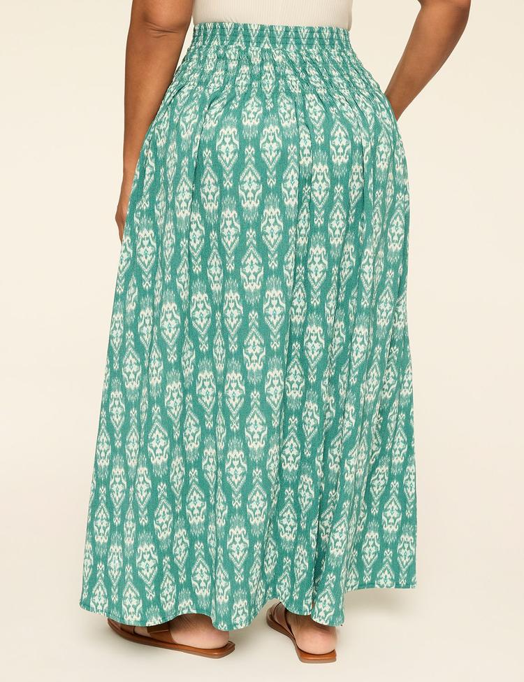 Embrace effortless spring and summer vibes with this Plus Size Smocked Waist Maxi Skirt in a soothing muted green and white ethnic ikat pattern. Crafted from a lightweight rayon-nylon blend, this midi-length wrap skirt features a comfortable elasticated and tie-up smocked waistband that flatters your shape while offering easy wearability. The clean hemline and flowing silhouette make it perfect for casual outings, brunch with friends, or relaxed vacation days. This bohemian-inspired piece combines comfort and style, making it a versatile addition to your warm-weather wardrobe.