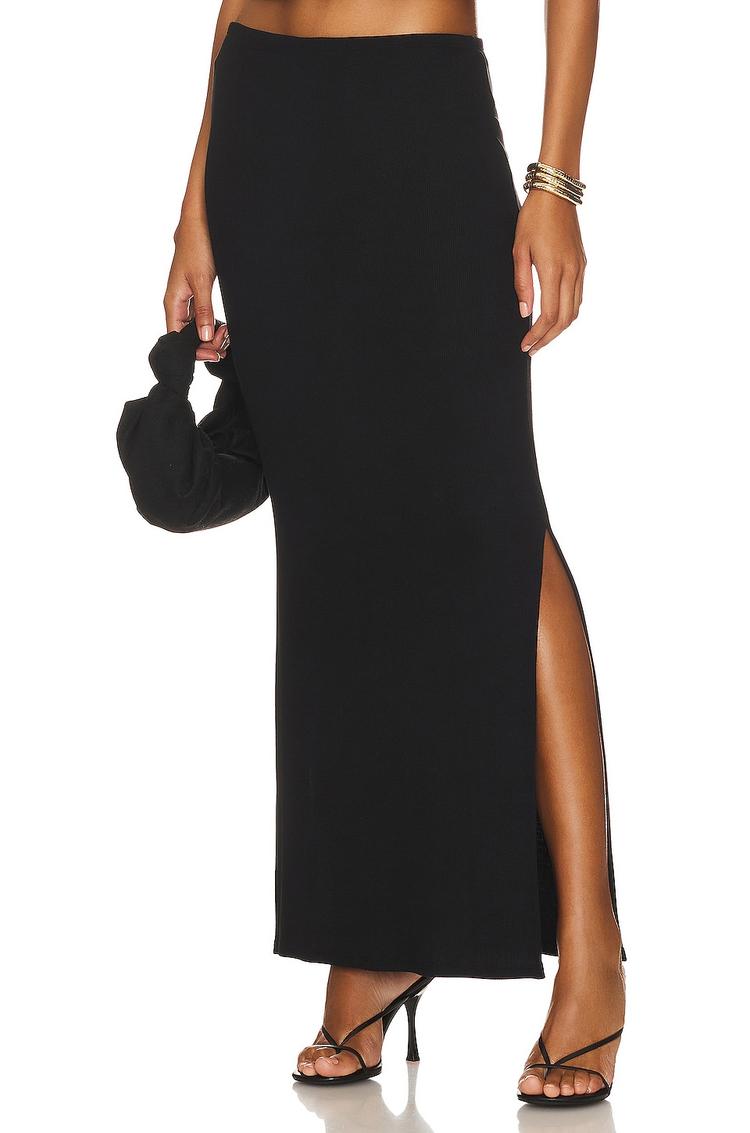 Effortless elegance meets everyday ease in this black ribbed maxi skirt. Crafted in a lightweight rayon-spandex jersey, it drapes softly with a flattering, slim-fit silhouette. The pull-on design with an elasticated waistband ensures a smooth, comfortable fit at the high waist, while the full-length hem glides to the floor. Strategic side slits reveal a hint of leg as you stride, adding a touch of drama to a versatile staple. Pair with a crop top for casual days, or dress it up with a blazer and heels for evening looks—timeless, modern, and endlessly wearable.