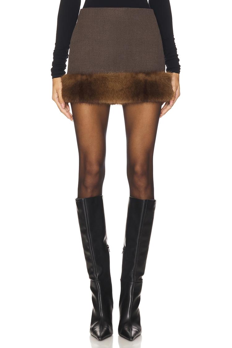 Luxe winter glamour meets street-smart chic in this Lovers and Friends x Emma Rose Kiely mini skirt. Crafted in a warm brown wool-polyester blend with a touch of viscose and a touch of elastane for a flattering, flexible fit, it’s finished with a plush faux fur trim at the hem for tactile drama. A hidden side zipper keeps the silhouette streamlined while the fully lined interior ensures comfort. At about 34 cm in length, this mini pairs beautifully with sleek knits and knee-high boots for date nights, parties, or refined city evenings.