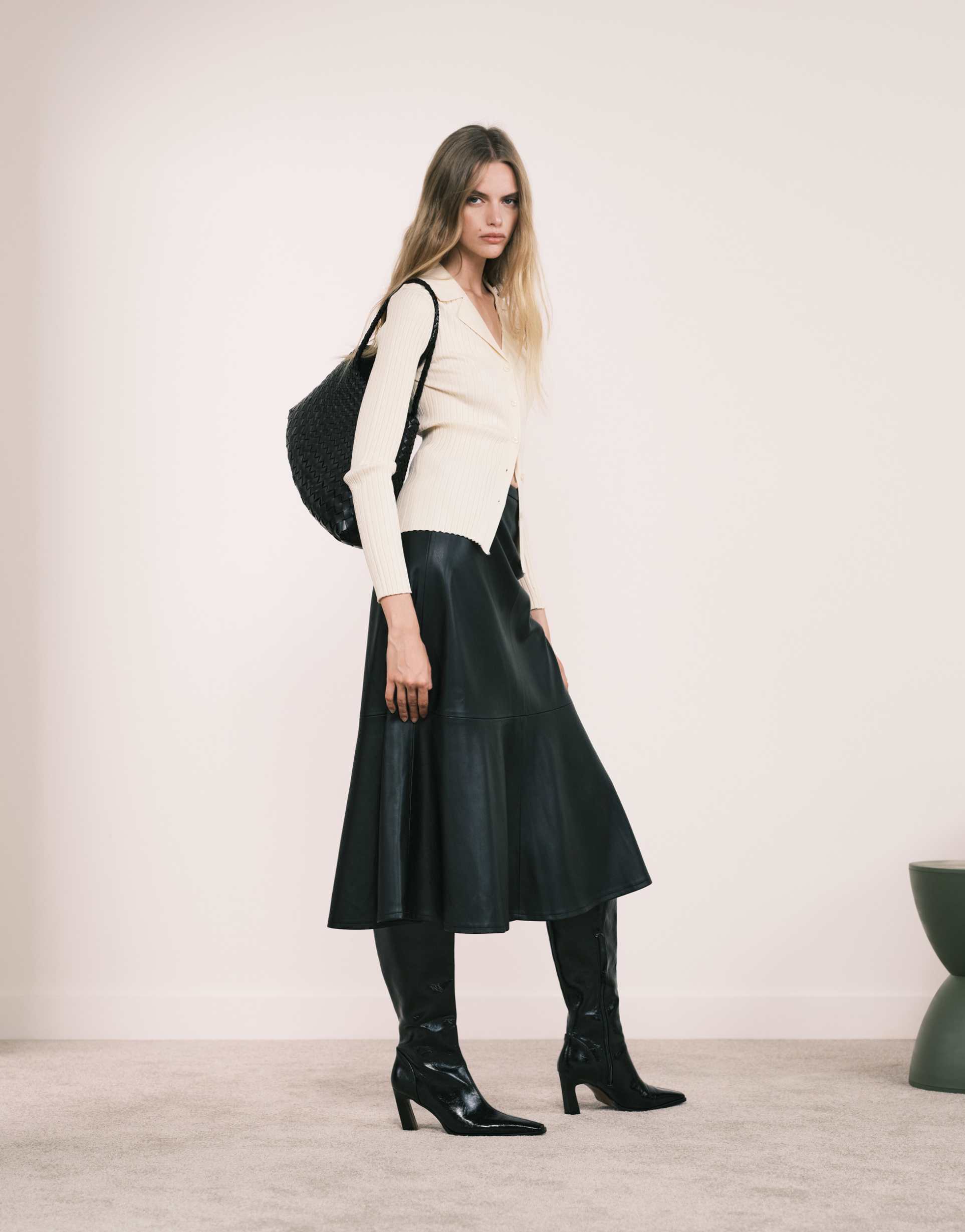 Bring a sleek, modern edge to your wardrobe with this black faux leather midi skirt by Mango. Crafted from matte coated polyester with a polyurethane finish, it boasts a flattering high-rise waist and a subtle drop hem that adds movement and dimension to its flared, gored silhouette. The flat-front waistband and regular fit ensure comfort and sophistication, perfect for both casual office days and refined everyday looks. Pair with boots and a fitted top for a chic, minimalist aesthetic that transitions effortlessly through autumn, winter, and spring seasons.