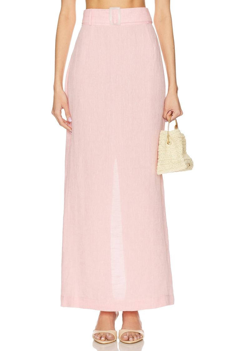 Elevate warm-weather styling with this belted maxi pencil skirt in soft pink linen. The high-rise silhouette sits neatly under a detachable tonal belt, delivering a clean, streamlined profile thanks to a hidden back zipper. Crafted from breathable linen, the midweight fabric drapes into a full-length, fitted shape that moves with you, yet remains unlined for airy comfort. Pair with a cropped top or crisp blouse for day-to-night polish—from brunch to vacation getaways, this versatile staple fuses classic tailoring with relaxed ease.