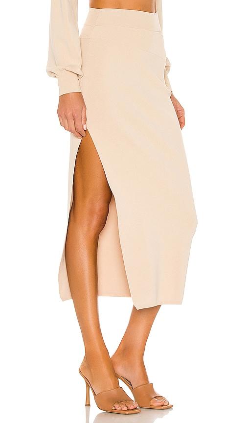 MICHAEL COSTELLO X REVOLVE CUT OUT KNIT MIDI SKIRT IN BEIGE.