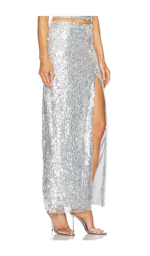 MICHAEL COSTELLO X REVOLVE SEONA MAXI SKIRT IN METALLIC SILVER.