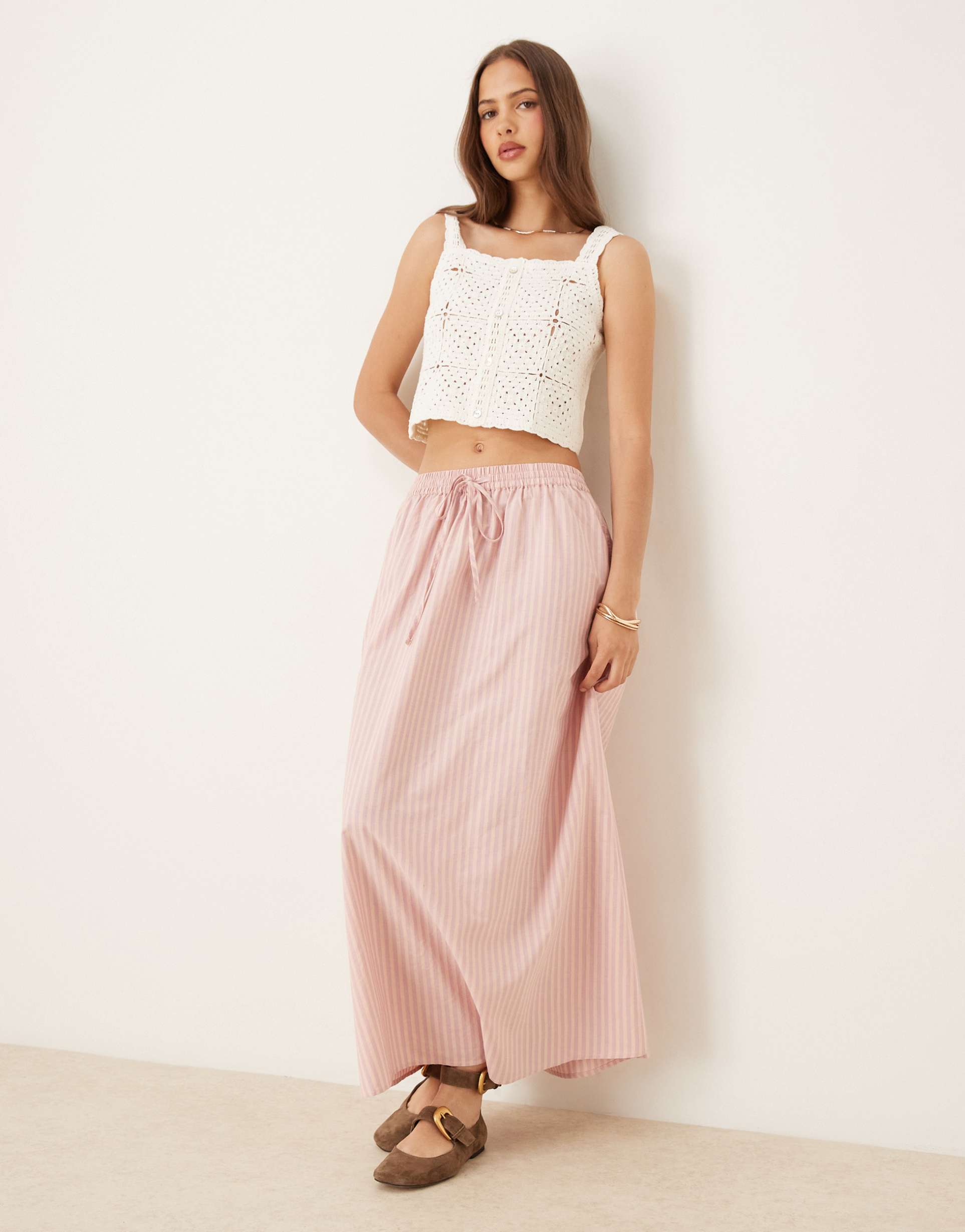 Effortless femininity meets everyday ease in this lilac stripe maxi from Miss Selfridge. The plain-woven fabric blends cotton and viscose for a soft, breathable drape that moves with you. A high-rise, elasticated waistband lends a comfortable, pull-on fit, while handy side pockets add practical charm to the flowing silhouette. The all-over lilac-and-white stripe creates a fresh, summery vibe that pairs beautifully with simple knits or airy camisoles. Style it for brunch, vacation days, or casual weekend outings—dress it up with sandals and a sunshine-ready smile, or keep it relaxed with flats for a pared-back, modern look.