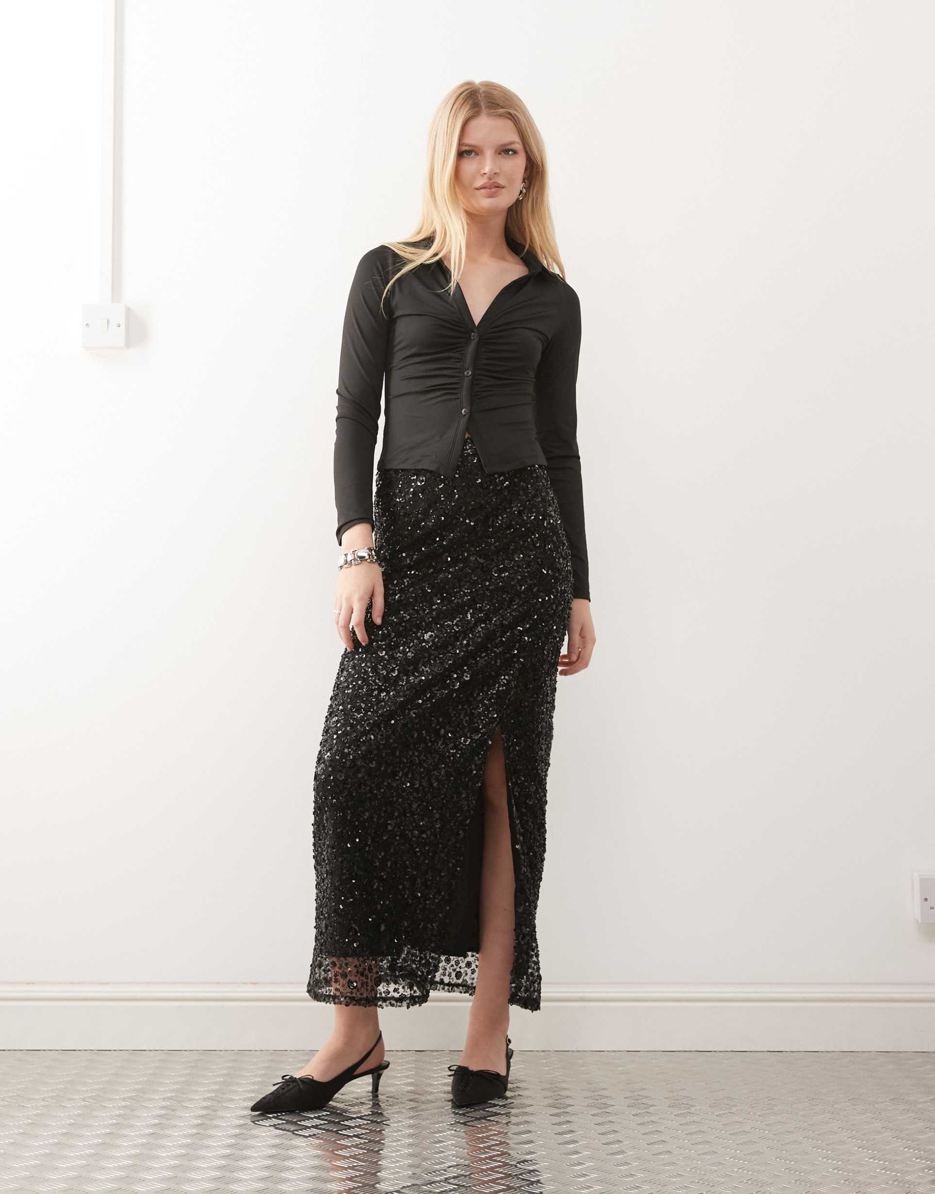 MISS SELFRIDGE SEQUIN MAXI SKIRT IN BLACK