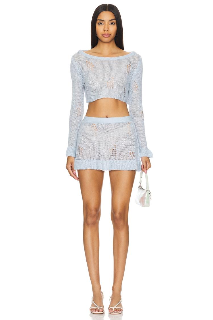Bring playful charm to your casual wardrobe with this light blue tiered mini skirt from More To Come. Crafted in a lightweight acrylic, wool, and polyamide knit blend, it offers a fitted silhouette with a comfortable mid-rise flat-front waistband and pull-on styling. The skirt features a delicate ruffled hemline layered for added movement, complemented by intentionally distressed details and ribbed trim for a trendy, modern look. Perfect for brunch dates or girls' nights, this cute and casual chic piece brings effortless style and texture to your everyday wear. Pair it with matching tops or simple separates for versatile, eye-catching outfits.
