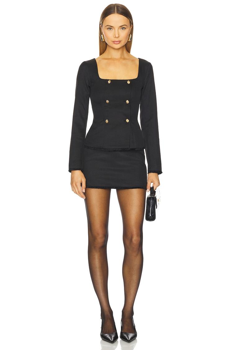 Own the moment with this sleek and sophisticated black mini skirt set, tailored for modern elegance. Crafted from smooth polyester, the fitted silhouette flatters the figure while the clean hemline and flat-front waistband create a polished look. The front button detailing adds a subtle touch of refinement and style. Perfect for chic casual outings, date nights, or evening events, this versatile set pairs effortlessly with sheer tights and pointed heels to elevate your ensemble. A timeless classic, this Jamie Skirt Set is designed to bring effortless sophistication to your wardrobe.