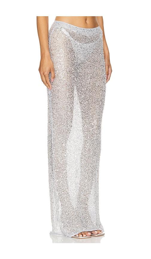 NBD SHANTI MAXI SKIRT IN METALLIC SILVER.