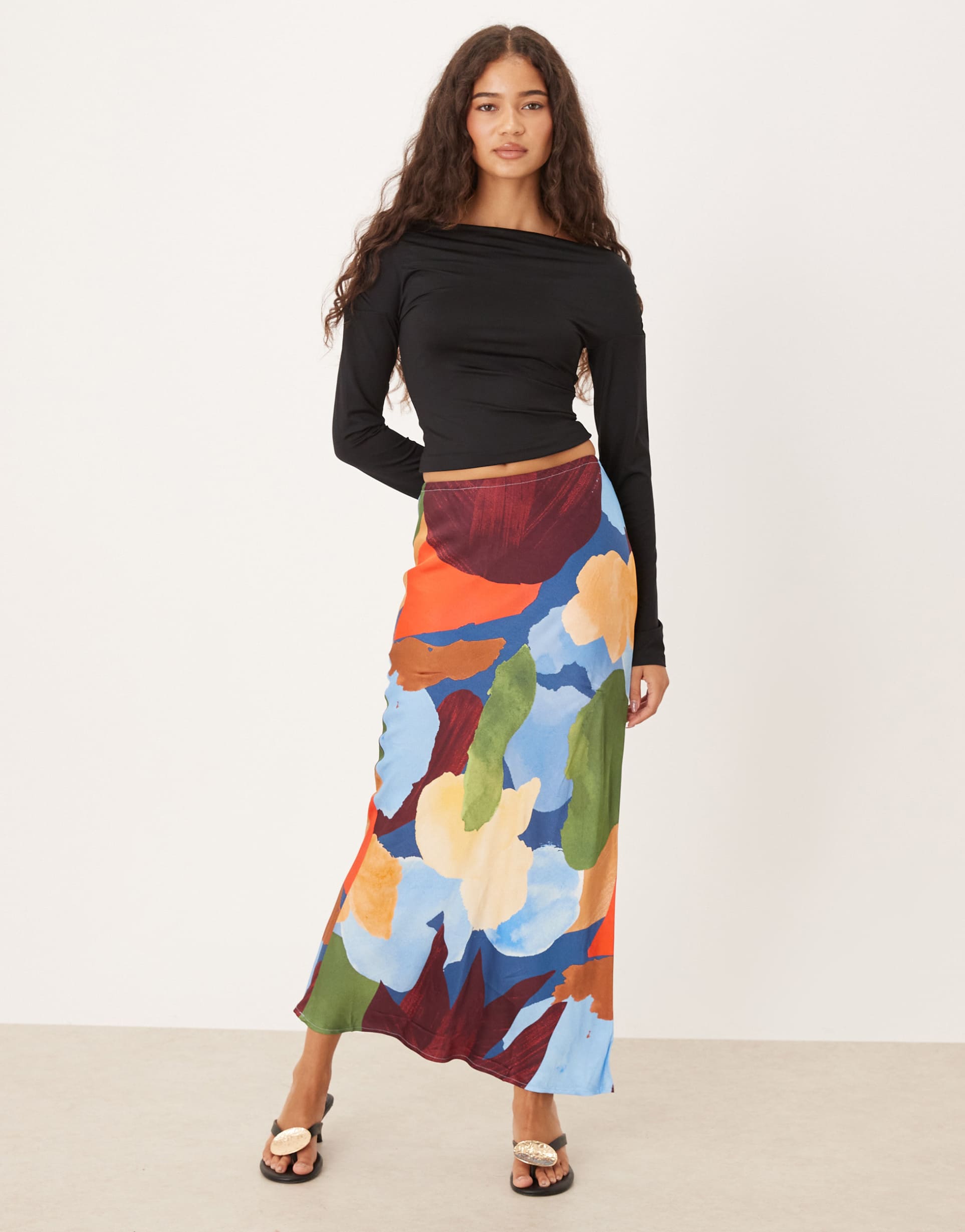 Effortless elegance meets painterly energy in this satin maxi skirt from Never Fully Dressed. A mid-rise, regular‑fit silhouette drapes to a floor‑skimming hem, catching light with a glossy satin sheen. The abstract print in a vibrant palette of blues, creams, and citrus tones creates a statement that's both sophisticated and wearable. Pair with a black knit or silk blouse for evening drama, or a simple tee for daytime polish. The all‑over print feels modern and versatile, ideal for vacations, brunches, and chic city strolls.