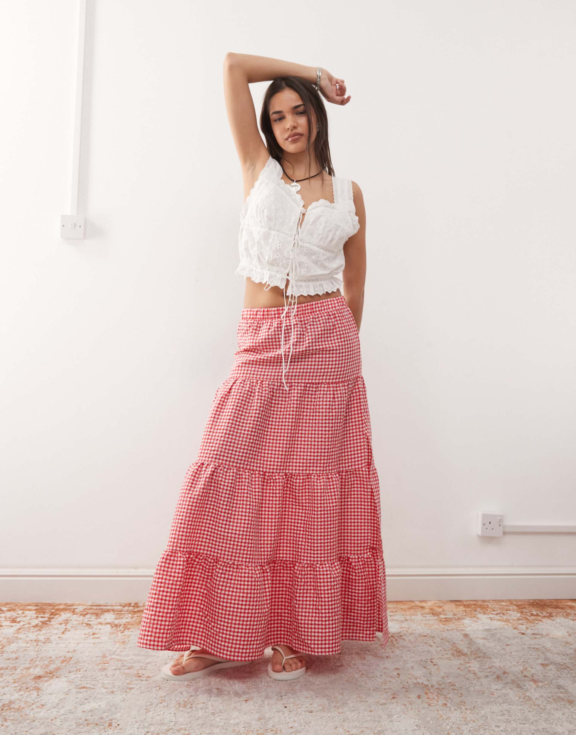 NOISY MAY TIERED MAXI SKIRT IN RED GINGHAM